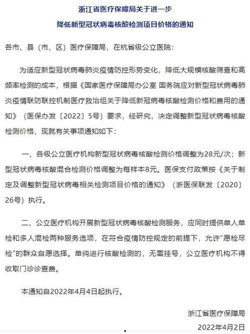 最近朋友圈里可是炸开了锅,大家都在热议一个话题——核酸价格。没错,就是那个我们几乎每周都要面对的核酸检测。今天,我就来给你揭秘最近核酸价格都有哪些新动态,让你心里有数,不再为这个小费用犯愁。